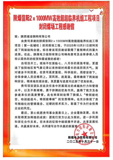 近日,陜西建設鋼構有限公司收到陜煤電力信陽有限公司發(fā)來的感謝信,信中對建設鋼構在承建陜煤信電2×1000MW高效超超臨界機組項目封閉煤場工程中表現(xiàn)的卓越的執(zhí)行力和管理水平以及不畏艱難、勇于拼搏的優(yōu)良作風表示誠摯的感謝!感謝信指出,陜煤信陽2×1000MW高效超超臨界機組工程項目封閉煤場工程于2025年10月31日順利完成了網(wǎng)架結構合攏,標志著該項目建設取得了里程碑式的重大進展。陜煤信電特向建設鋼構全體參建人員致以最熱烈的祝賀和最誠摯的感謝!感謝信中說,自項目開工以來,現(xiàn)場不僅面臨七、八月份的高溫考驗,更遭遇了信陽地區(qū)有...